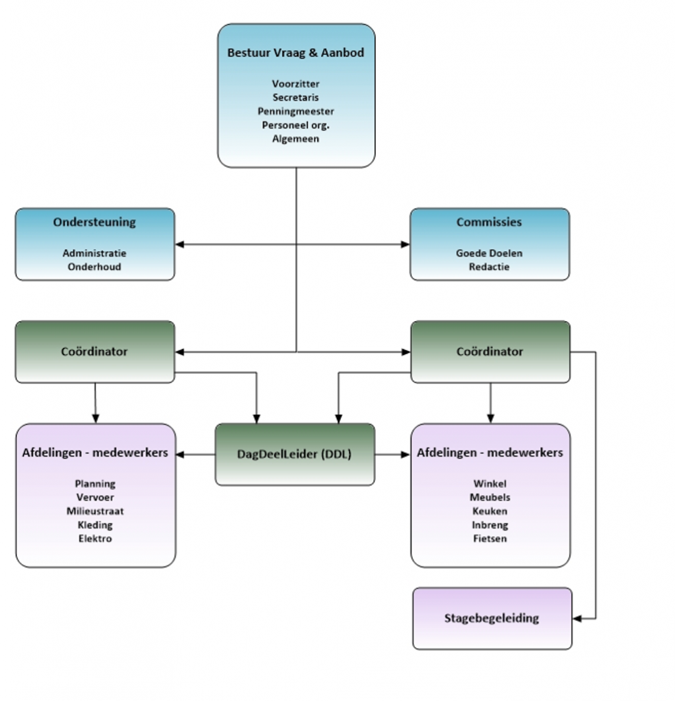 Onze winkel kent verschillende afdelingen die specifiek werk verrichten zoals Inbreng, Kleding, Meubels en Bedden, Boeken/CD’s, Speelgoed, Servies etc, Electra, Fietsen, Planning & Vervoer, de Financiële Administratie.